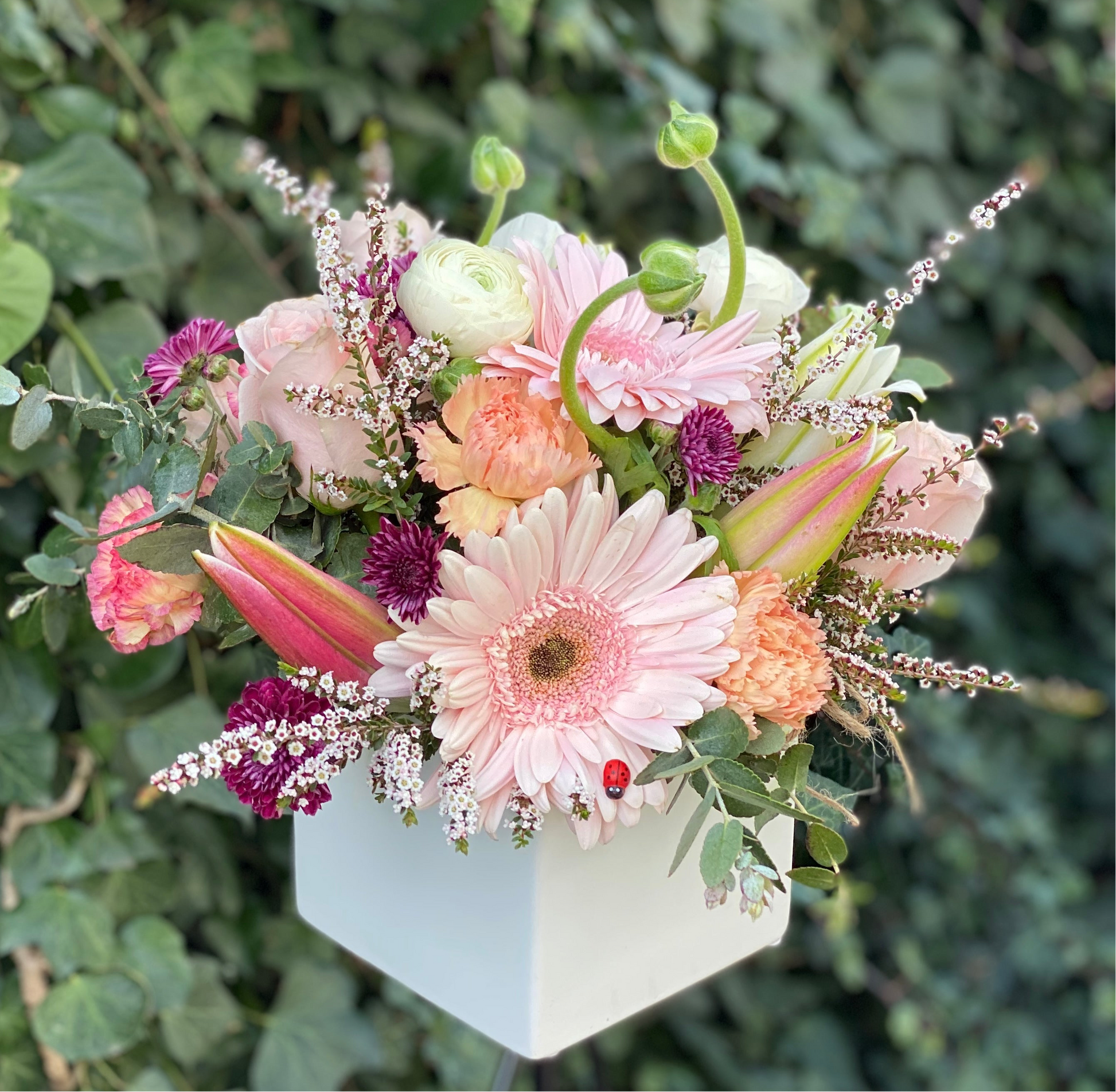Nestled in a ceramic pot, this ceramic arrangement may feature a romantic medley of roses, lisianthus, disbuds, gerberas and ranunculus, handpicked for their texture and color harmony. Each piece is carefully balanced with lush, mixed foliage to create an elegant, full-bodied design that feels both modern and classic.
